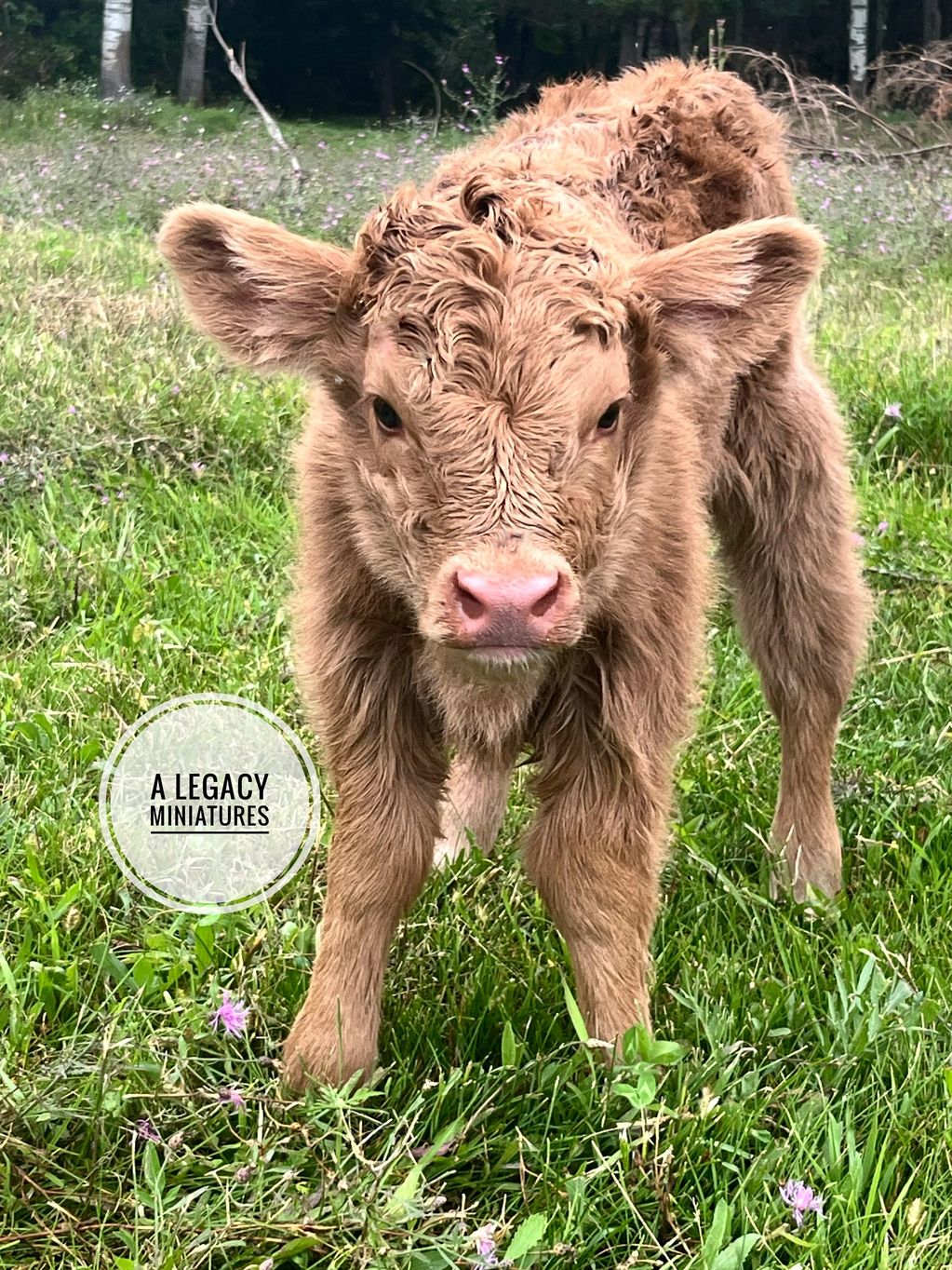 Miss Addie was was born August 15, 2025 to our small framed white highland heifer Lace & is sired by our Highpark bull, Heartbreaker from Pandarosa miniatures. She is a gorgeous yellow heifer with tons of hair! She will make a great addition to any breeding program or would make a wonderful pet.